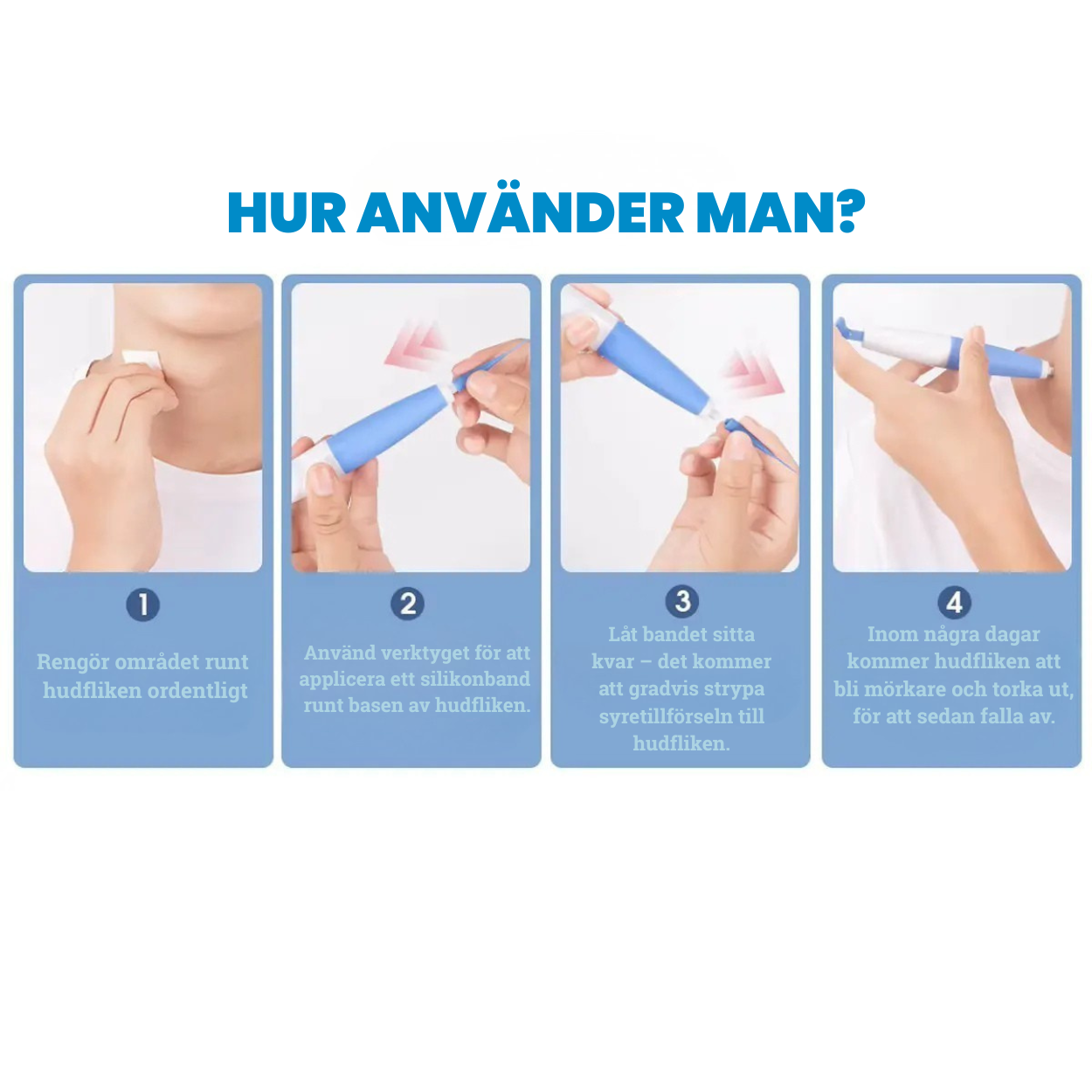 - Enkel och Smärtfri Användning: Placera silikonbandet runt hudfliken med den medföljande verktyget och låt processen sköta sig själv.